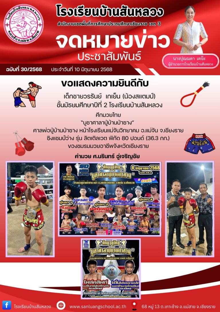 ขอแสดงความยินดีกับ เด็กชายวรธัน เกย์เย็น (น้องแสตมป์) ชั้นมัธยมศึกษาปีที่ 2 โรงเรียนบ้านสันหลวง