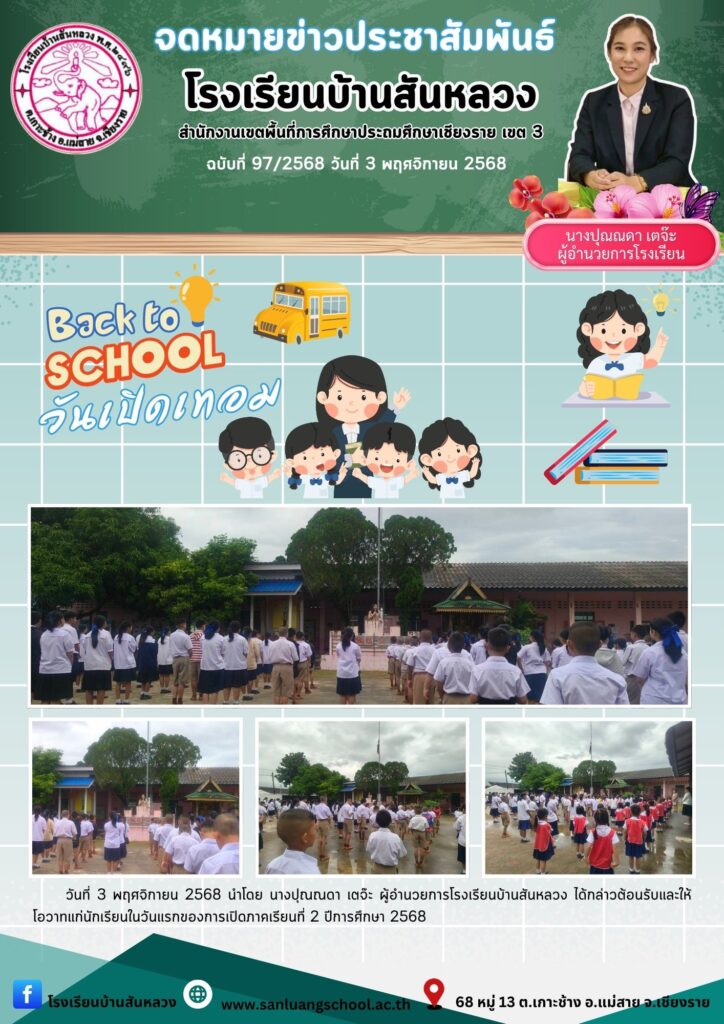 วันที่ 3 พฤศจิกายน 2568 นำโดย นางปุณณดา เตจ๊ะ ผู้อำนวยการโรงเรียนบ้านสันหลวง ได้กล่าวต้อนรับและให้โอวาทแก่นักเรียนในวันแรกของการเปิดภาคเรียนที่ 2 ปีการศึกษา 2568