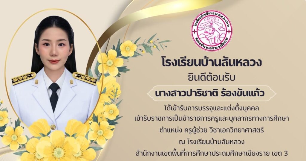 โรงเรียนบ้านสันหลวง ยินดีต้อนรับ นางสาวปาริชาติ ร้องขันแก้ว (ครูเฟิร์น)ได้รับการบรรจุแต่งตั้งบุคคล เข้ารับราชการเป็นข้าราชการครูและบุคลากรทางการศึกษา ตำแหน่ง ครูผู้ช่วย วิชาเอกวิทยาศาสตร์ ณ โรงเรียนบ้านสันหลวงสำนักงานเขตพื้นที่การศึกษาประถมศึกษาเชียงราย เขต 3