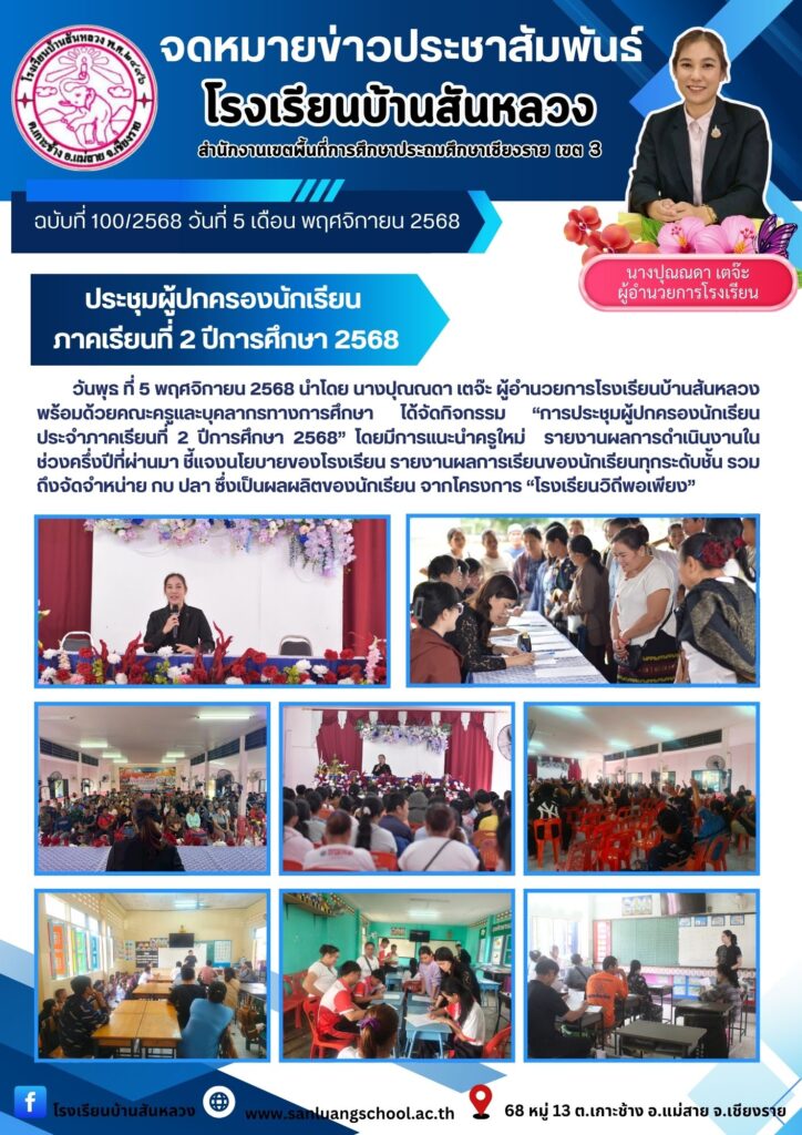วันพุธ ที่ 5 พฤศจิกายน 2568 นำโดย นางปุณณดา เตจ๊ะ ผู้อำนวยการโรงเรียนบ้านสันหลวง พร้อมด้วยคณะครูและบุคลากรทางการศึกษา ได้จัดกิจกรรม “การประชุมผู้ปกครองนักเรียน ประจำภาคเรียนที่ 2 ปีการศึกษา 2568” โดยมีการแนะนำครูใหม่ รายงานผลการดำเนินงานในช่วงครึ่งปีที่ผ่านมา ชี้แจงนโยบายของโรงเรียน รายงานผลการเรียนของนักเรียนทุกระดับชั้น รวมถึงจัดจำหน่าย กบ ปลา ซึ่งเป็นผลผลิตของนักเรียน จากโครงการ “โรงเรียนวิถีพอเพียง”