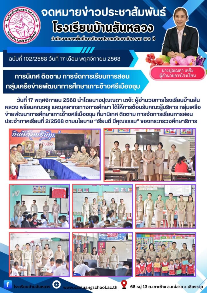 วันที่ 17 พฤศจิกายน 2568 นำโดยนางปุณณดา เตจ๊ะ ผู้อำนวยการโรงเรียนบ้านสันหลวง พร้อมคณะครู และบุคลากรทางการศึกษา ได้ให้การต้อนรับคณะผู้บริหาร กลุ่มเครือข่ายพัฒนาการศึกษาเกาะช้างศรีเมืองชุม ที่มานิเทศ ติดตาม การจัดการเรียนการสอน ประจำภาคเรียนที่ 2/2568 ตามนโยบาย “เรียนดี มีคุณธรรม” ของกระทรวงศึกษาธิการ