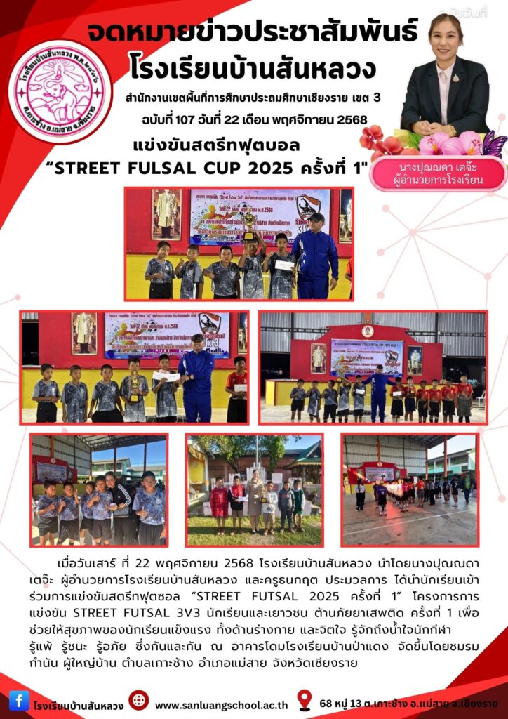 เมื่อวันเสาร์ ที่ 22 พฤศจิกายน 2568 โรงเรียนบ้านสันหลวง นำโดยนางปุณณดา เตจ๊ะ ผู้อำนวยการโรงเรียนบ้านสันหลวง และครูธนกฤต ประมวลการ ได้นำนักเรียนเข้าร่วมการแข่งขันสตรีทฟุตซอล “STREET FUTSAL 2025 ครั้งที่ 1” โครงการการแข่งขัน Street futsal 3v3 นักเรียนและเยาวชน ต้านภัยยาเสพติด ครั้งที่ 1 เพื่อช่วยให้สุขภาพของนักเรียนแข็งแรง ทั้งด้านร่างกาย และจิตใจ รู้จักถึงน้ำใจนักกีฬา รู้แพ้ รู้ชนะ รู้อภัย ซึ่งกันและกัน ณ อาคารโดมโรงเรียนบ้านป่าแดง จัดขึ้นโดยชมรมกำนัน ผู้ใหญ่บ้าน ตำบลเกาะช้าง อำเภอแม่สาย จังหวัดเชียงราย