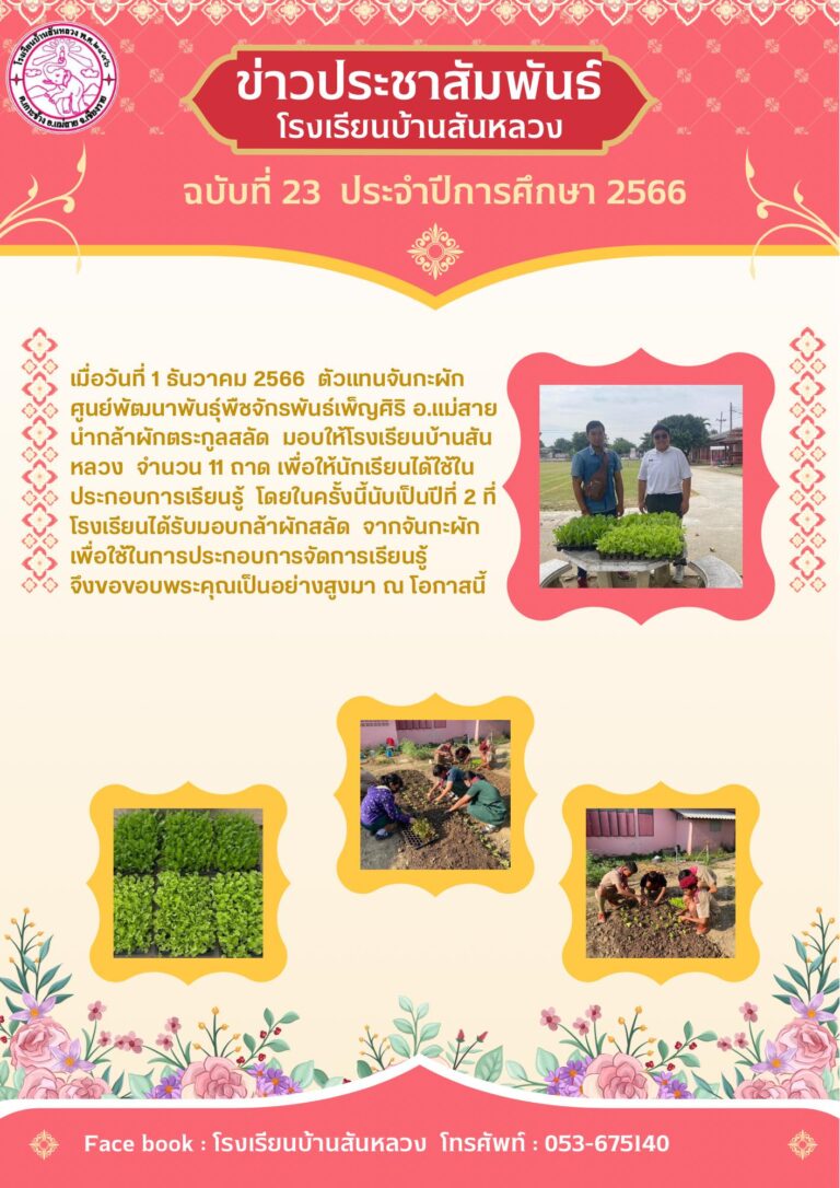 ศูนย์พัฒนาพันธุ์พืชจักรพันธ์เพ็ญศิริ อ.แม่สาย นำกล้าผักตระกูลสลัด มอบให้โรงเรียนบ้านสันหลวง จำนวน 11 ถาด
