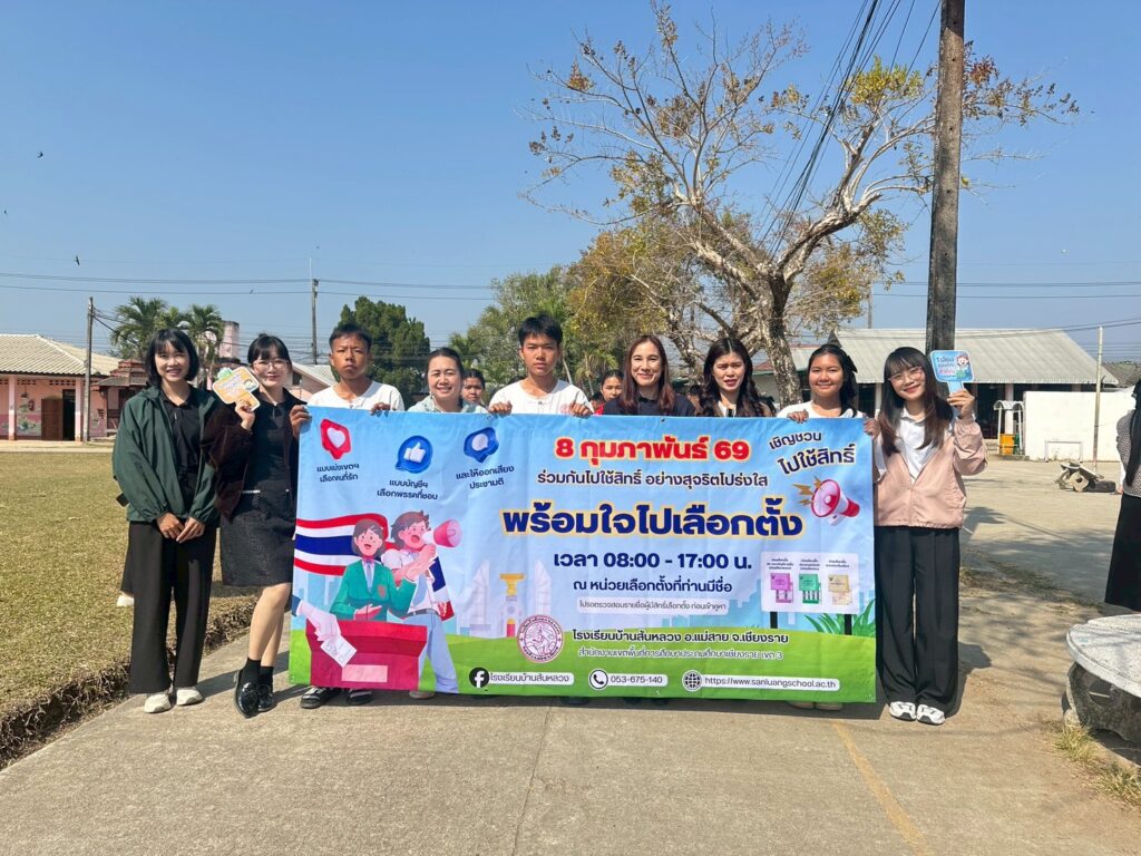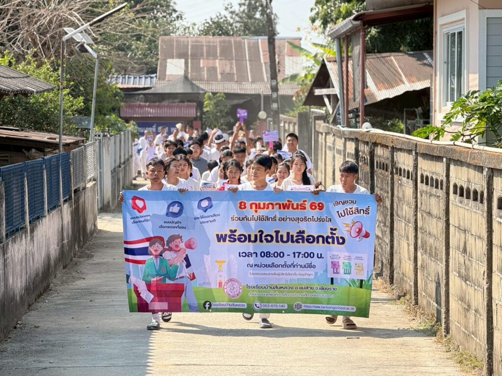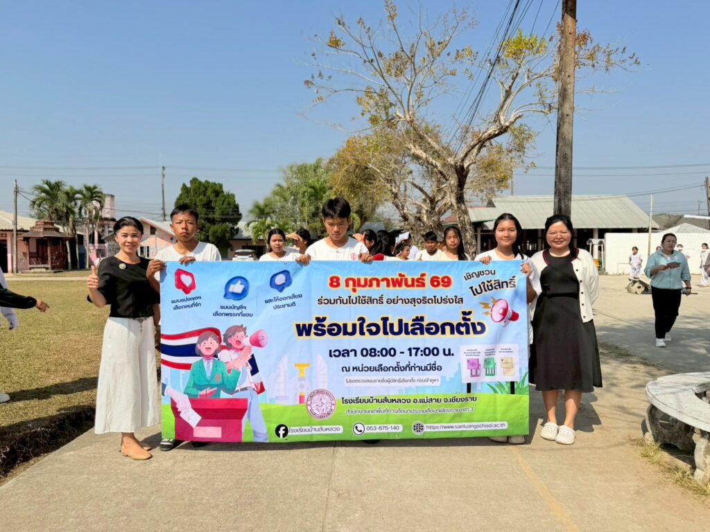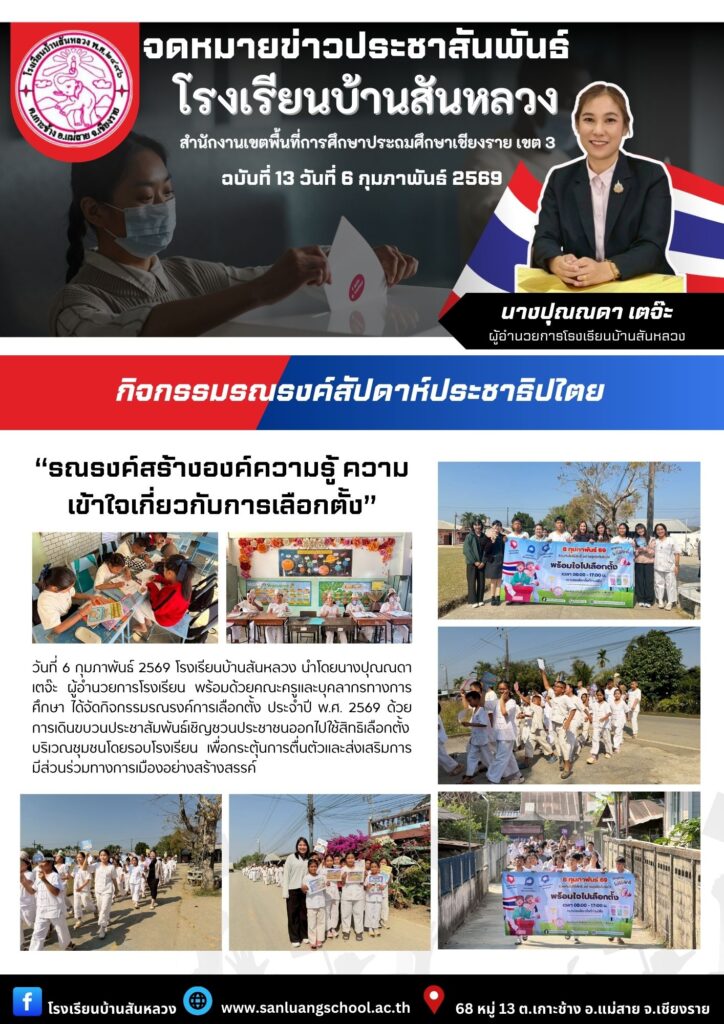 วันที่ 6 กุมภาพันธ์ 2569 โรงเรียนบ้านสันหลวง นำโดยนางปุณณดา เตจ๊ะ ผู้อำนวยการโรงเรียน พร้อมด้วยคณะครูและบุคลากรทางการศึกษา ได้จัดกิจกรรมรณรงค์การเลือกตั้ง ประจำปี พ.ศ. 2569 ด้วยการเดินขบวนประชาสัมพันธ์เชิญชวนประชาชนออกไปใช้สิทธิเลือกตั้ง บริเวณชุมชนโดยรอบโรงเรียน เพื่อกระตุ้นการตื่นตัวและส่งเสริมการมีส่วนร่วมทางการเมืองอย่างสร้างสรรค์