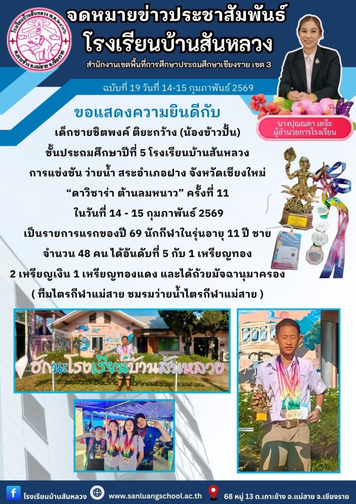 เด็กชายชิตพงค์ ติยะกว้าง (น้องข้าวปั้น) ชั้นประถมศึกษาปีที่ 5 โรงเรียนบ้านสันหลว การแข่งขัน ว่ายน้ำ สระอำเภอฝาง จังหวัดเชียงใหม่ “ดาวิซาร่า ต้านลมหนาว” ครั้งที่ 11 ในวันที่ 14 – 15 กุมภาพันธ์ 2569 เป็นรายการแรกของปี 69 นักกีฬาในรุ่นอายุ 11 ปี ชาย จำนวน 48 คน ได้อันดับที่ 5 กับ 1 เหรียญทอง 2 เหรียญเงิน 1 เหรียญทองแดง และได้ถ้วยมัจฉานุมาครอง ( ทีมไตรกีฬาแม่สาย ชมรมว่ายน้ำไตรกีฬาแม่สาย )