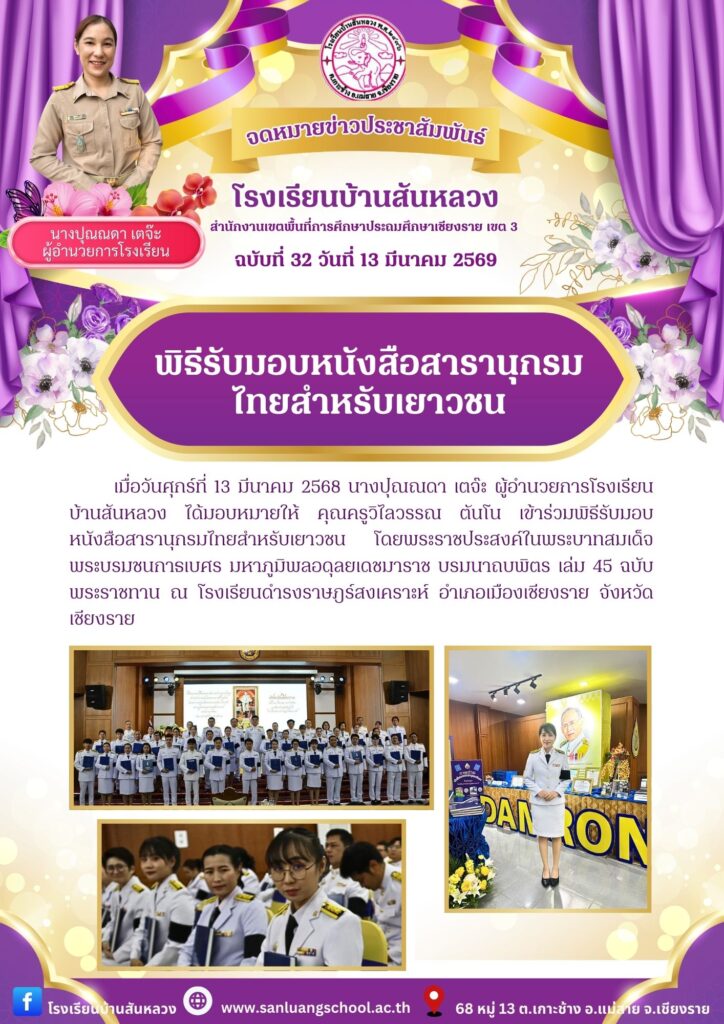 เมื่อวันศุกร์ที่ 13 มีนาคม 2568 นางปุณณดา เตจ๊ะ ผู้อำนวยการโรงเรียนบ้านสันหลวง ได้มอบหมายให้ คุณครูวิไลวรรณ ตันโน เข้าร่วมพิธีรับมอบหนังสือสารานุกรมไทยสำหรับเยาวชน โดยพระราชประสงค์ในพระบาทสมเด็จพระบรมชนกาธเบศร มหาภูมิพลอดุลยเดชมาราช บรมนาถบพิตร เล่ม 45 ฉบับพระราชทาน ณ โรงเรียนดำรงราษฎร์สงเคราะห์ อำเภอเมืองเชียงราย จังหวัดเชียงราย